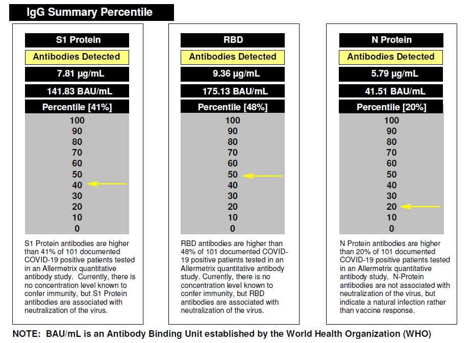(reported in ug/mL and WHO international units) and indicates how much antibody you have